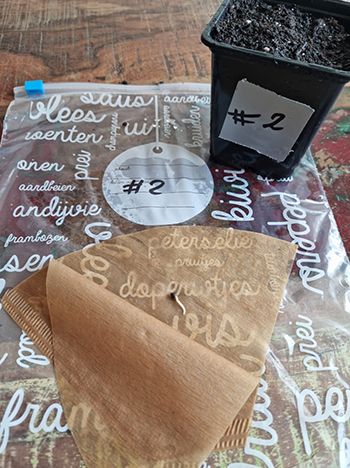Update 11 mei 2022: Hoi, ik ben gestart op 28 april en heb ontkiemd in koffiefilters. Op 2 mei gingen de zaden hun potjes in. Opvallend is de lengte van de wortels; de volgorde is bijna gelijk aan de nummers. Nummer 1 ging het beste, nummer 5 ging het minst goed. Nummer 5 is wel uitgekomen maar blijft erg achter qua wortel en ziet er niet gezond uit.