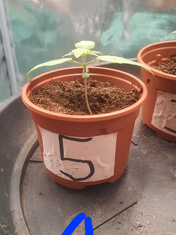 De jiffy pluggen heb ik in een dichte propagator gedaan en toen de eerste dametjes boven kwamen en hun zaadhulsen afwierpen, heb ik de schuifjes iets opengezet. De luchtvochtigheid bleef op een stabiele 85% dus ze gingen lekker rap. Het wachten was alleen op zaadje #5 …die kwam maar niet. Na dit gemeld te hebben bij CNNBS kreeg ik een nieuwe toegestuurd en ja hoor, een dag later was de nummer #5 die ik eigenlijk wilde afschrijven toch iets boven!