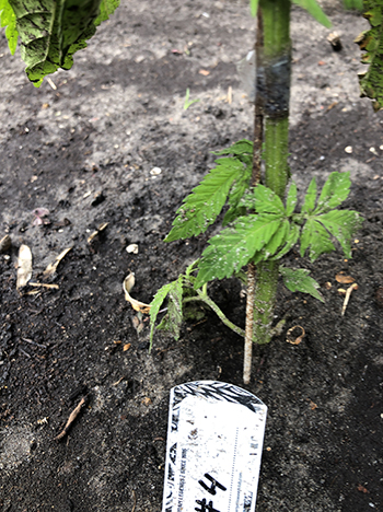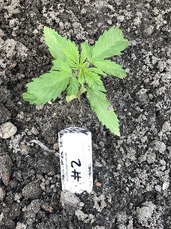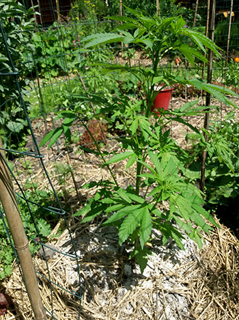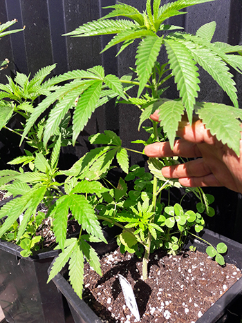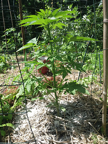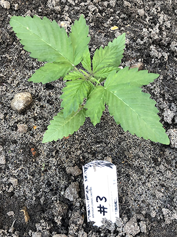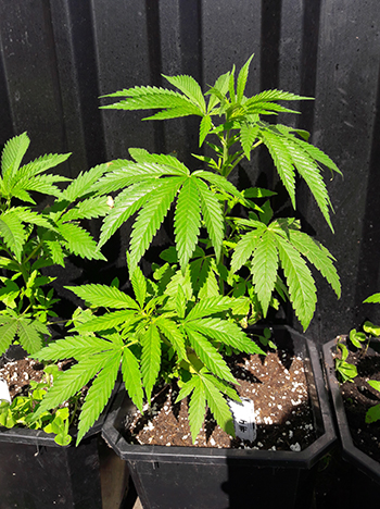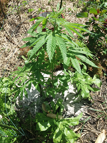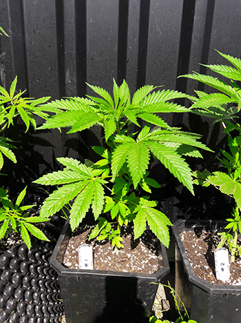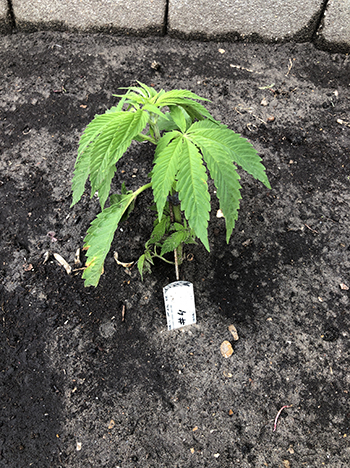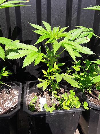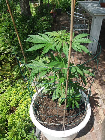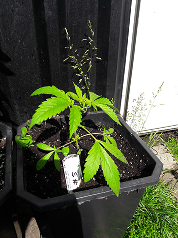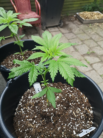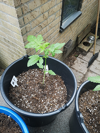 Nummer 5 is na een aantal weken nog steeds erg klein en lijkt me ook een wat minder vigoreus plantje. De andere drie dames lijken het super naar hun zin te hebben in mijn eigen opgewaardeerde aardemix, en krijgen prachtige handgrote bladeren met zeven vingers vanaf de vierde node. Ze hebben een mooie diepgroene kleur echter wat bruine puntjes door wat storm die we gehad hebben. Maar ja dit is een outdoor grow en je hebt toch altijd te maken met wat moeder natuur je voor je kiezen geeft …iets met roeien en riemen 😉