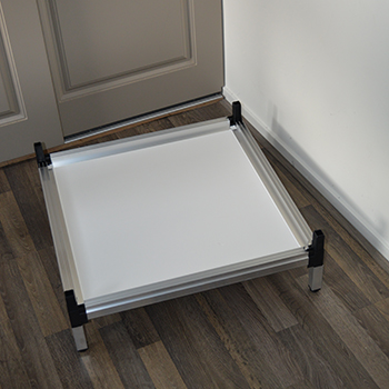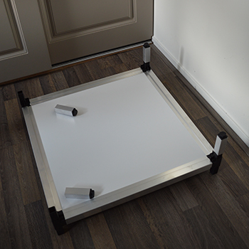 Je begint met het openen van de doos met daarin de bodem en bovenkant. Deze zitten enkel voor tijdens het vervoer, aan elkaar verbonden met korte hoekprofielen. Haal ze van elkaar af en gooi de korte hoekprofielen weg of bewaar ze voor als je de CNNBS kweekkast zelf nog eens moet vervoeren. Neem de bodemplaat en plaats die ondersteboven op de grond en schuif de vier aluminium pootjes over de zwarte hoekstukken.