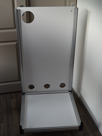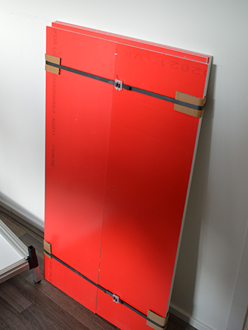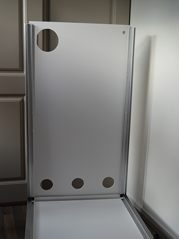 Draai de bodemplaat om, zodat hij op zijn pootjes staat. Nu plaats je achtereenvolgens één van de lange achterste hoekprofielen, de achterwand (met de drie luchtgaten naar beneden en het grote gat linksboven) en een tweede hoekprofiel. De hoekprofielen schuiven net als de pootjes over de zwarte hoekstukken. De wandplaten hebben een beschermende rode folie die je er eerst af moet halen, de beschermde kant komt aan de binnenkant van de kast.