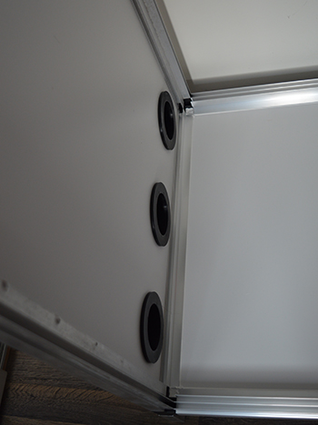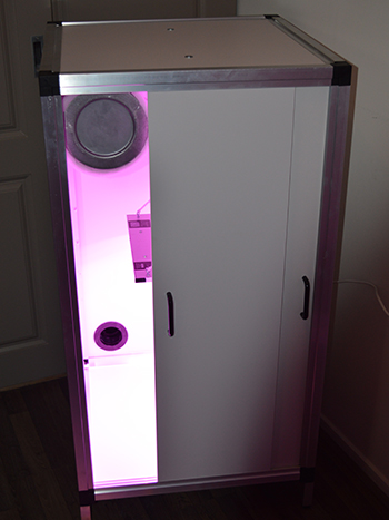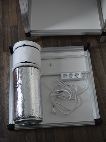 Voordat je verder gaat met het plaatsen van de andere zijwanden, plaats je eerst de drie lichtdichte luchtingangen aan de onderzijde van de achterwand. Je kunt ze naar binnen of naar buiten plaatsen, omdat ik graag alle ruimte in mijn kweekkast benut, plaats ik ze aan de buitenkant. Ik schuif hiervoor het ene deel vanuit de binnenkant door een van de gaten en plaats het andere deel ertegenaan. Een kwartslag draaien en ze zetten stevig op hun plek.