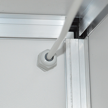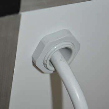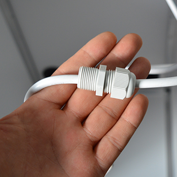 De kweekkast begint al vorm te krijgen, tijd om de stekker te monteren. Neem de kabel van het stekkerblok en schuif daarover de bijgeleverde kabeldoorvoer. Trek de kabel door het kleine gat in de achterwand en monteer de kabeldoorvoer, draai hem goed aan zodat er geen licht door naar binnen kan.