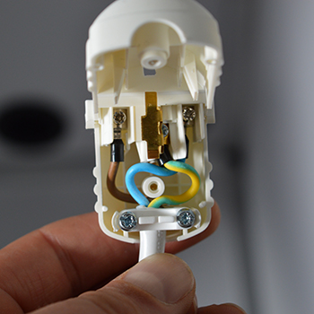 Aan het uiteinde van de kabel monteer je nu de meegeleverde stekker. Dit is de eerste keer dat je gereedschap nodig hebt, een kleine schroevendraaier om de stekker mee te monteren. De geelgroene draad schroef je vast in het midden van de stekker, dit is de aardedraad. De blauwe en bruine draden gaan rechts en links op de pinnen van de stekker, welke je links en welke je rechts plaatst maakt niet uit.