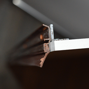 Wanneer de bovenplaat geplaatst is, neem je de zwarte flens en schuif je die vanaf de achterzijde van de kast door het gat voor de afzuiger en demper. De flens schuift over de demper heen waardoor ook die vast op zijn plek gehouden wordt.