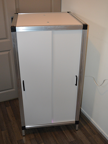 De CNNBS kweekkast is bijna klaar voor gebruik, alleen de deurtjes moeten nog gemonteerd worden. Deze schuiven in de sleuven van de aluminium profielen. Om ze goed te laten glijden zijn vier plastic U-profieltjes meegeleverd. Deze gaan op elkaar, met de open zijde naar beneden, in de twee sleuven aan de onderkant van de kast. Twee op elkaar per sleuf, zodat de deurtjes er overheen kunnen glijden.