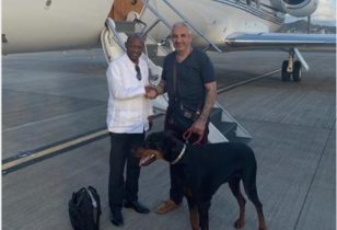 Alki David (r) met de voormalige premier van St. Kitts en met Vader, de doberman van de miljardair, voor de trap van de privéjet… [foto: swissx]
