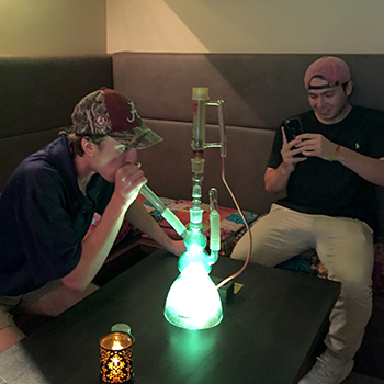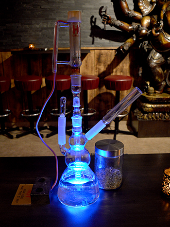 Op de grote tafel staan twee grote, door gekleurde leds verlichtte verdampers van Dé Verdamper. Als je even om een uitleg vraagt krijg je die en mag je er naar hartelust mee blazen. De Verdamper staat bekend als een van de beste verdampers die er zijn, en dat merkte ook een van de Amerikaanse jongens op, ‘This has to be the best vaporizer ever!‘ Wie liever uit een traditionele bong rookt kan rekenen op een originele BABA-bong, desgewenst mét, of zonder ijsblokjes.