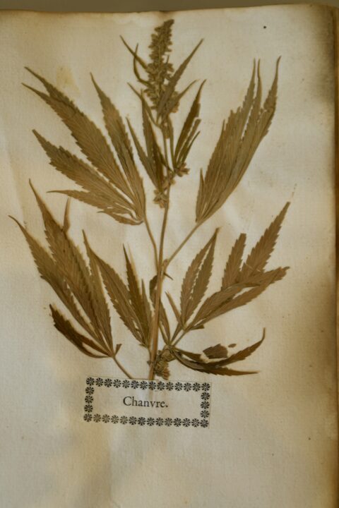 Het lijvige boek ligt in een vitrine, opengeslagen op de bladzijde waar een direct herkenbare wietplant (!) is ingeplakt. Chanvre, hennep, vermeldt het naamplaatje. Chapeau voor degene die net deze bladzijde heeft open gelegd, met het bewijs dat de Fransen al zeker 250 jaar mediwiet gebruiken.