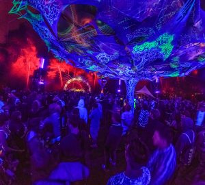 Na het vallen van de nacht, bewoog het enorm diverse publiek zich als een vrolijk oermens voort, terwijl menigeen oplichtte onder de blacklight lampen.