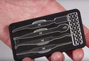 De Dabit Card is aan een zijde prachtig bedrukt met een stoere olifanten- of leeuwenkop maar de echte innovatie vinden we aan de voorzijde. Een strook bovenaan is voorzien van speciaal geslepen gaten om wiet mee te vermalen en daaronder bevinden zich acht dab-gereedschappen die naadloos in speciaal daarvoor uitgefrezen sleuven plakken. De tools zijn voorzien van magneten zodat ze daar netjes blijven zitten tot je ze er zelf uithaalt.