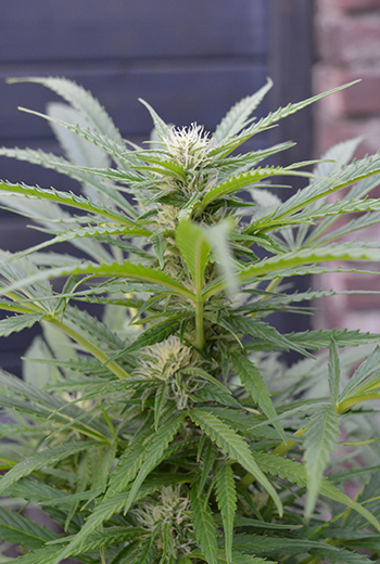 Met haar lange 7-vingerige bladeren lijkt Autoflower #4 het ook goed naar haar zin te hebben. De topvorming verloopt prima en de witte bloeiharen steken mooi af tegen het groen. Al beperkt de bloei zich hier wel een beetje tot de bovenkant van de plant. Autoflower #4 heeft wat smallere bladvingers, waardoor ik inschat dat ze wat meer sativa genen in zich heeft dan de rest.