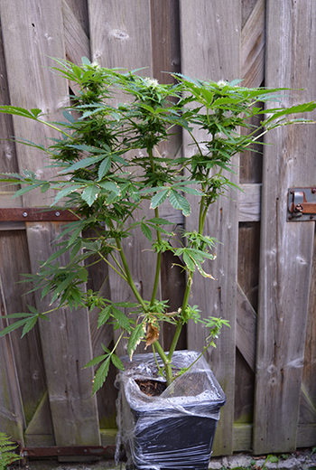 Qua hoogte verschillen ze niet heel veel; Autoflower #1 is met als de rest ongeveer 60 centimeter geworden. Ze heeft zich kranig overeind gehouden in de wind, en is net als de andere dames hier en daar aangevreten door de slakken, zoals je ziet. De topvorming is goed op gang gekomen met dikke witte bloeiharen. De buds plakken ook al behoorlijk en geven een lekkere zoete geur af als je ze aanraakt. Qua bladeren lijkt deze plant eerder indica dan sativa dominant.