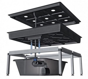 Toen het systeem eenmaal in elkaar zat, heb ik het voedingsreservoir gevuld. Er ging 38 liter water in het systeem; de EC-waarde van het water heb ik op 1,4 en de pH waarde is ongeveer 6,0. Ideaal lijkt me zo, ik zal de pH waarde zeker in het begin nog wel even goed en regelmatig in de gaten houden, want ik weet nog van de bubble bucket dat die in het begin behoorlijk kon schommelen. Ik ben benieuwd hoe dat met dit systeem gaat. Ook heb ik 38 milliliter waterstofperoxide aan het voedingswater toegevoegd. Dit zorgt voor meer zuurstof bij de wortels, en gaat algengroei tegen. Als je er meer over wil weten, lees dan H2O2 = mooie wortels & meer oogst, dat gaat over de werking van waterstofperoxide bij wietplanten.