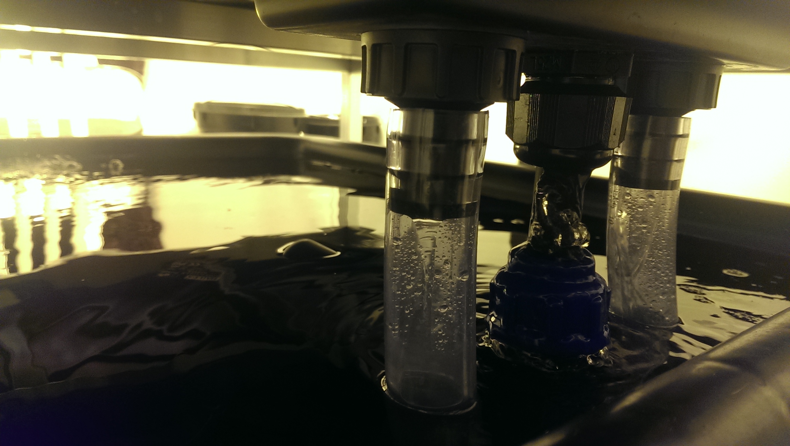 Toen het systeem eenmaal in elkaar zat, heb ik het voedingsreservoir gevuld. Er ging 38 liter water in het systeem; de EC-waarde van het water heb ik op 1,4 en de pH waarde is ongeveer 6,0. Ideaal lijkt me zo, ik zal de pH waarde zeker in het begin nog wel even goed en regelmatig in de gaten houden, want ik weet nog van de bubble bucket dat die in het begin behoorlijk kon schommelen. Ik ben benieuwd hoe dat met dit systeem gaat. Ook heb ik 38 milliliter waterstofperoxide aan het voedingswater toegevoegd. Dit zorgt voor meer zuurstof bij de wortels, en gaat algengroei tegen. Als je er meer over wil weten, lees dan H2O2 = mooie wortels & meer oogst, dat gaat over de werking van waterstofperoxide bij wietplanten.