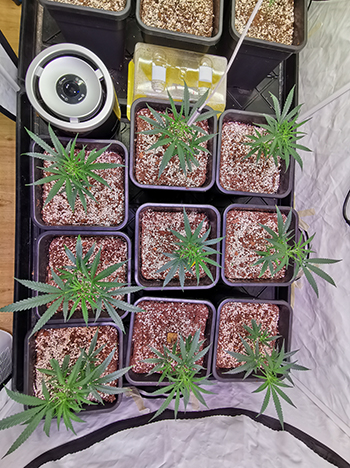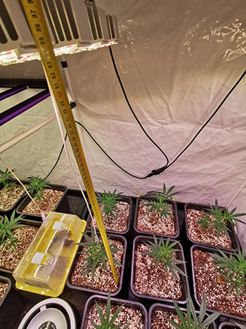 Aan het begin van week twee groeien de planten goed, maar sommigen kregen gele bladpuntjes. Ik vermoedde dat ze iets teveel licht kregen voor hun formaat, en besloot daarom om de twee LED-lampen hoger te hangen. De Lumatek Zeus Pro 600W verhoogde ik tot 75 cm afstand, en de twee SANlight Q6W-Gen.2 lampen hing ik 90 centimeter boven de toppen van de planten.