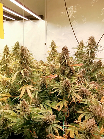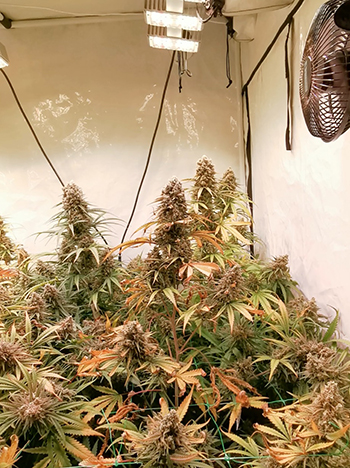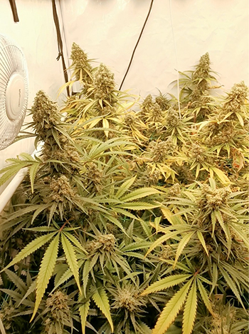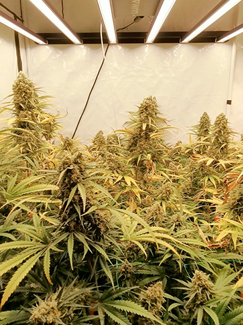 Aan het einde van week 10 (bloeiweek #7) zijn de 18 Cannalope Haze planten van DNA Genetics klaar om te oogsten. Alle planten vergelen nu, en er groeien bijna geen nieuwe witte bloeihaartjes.