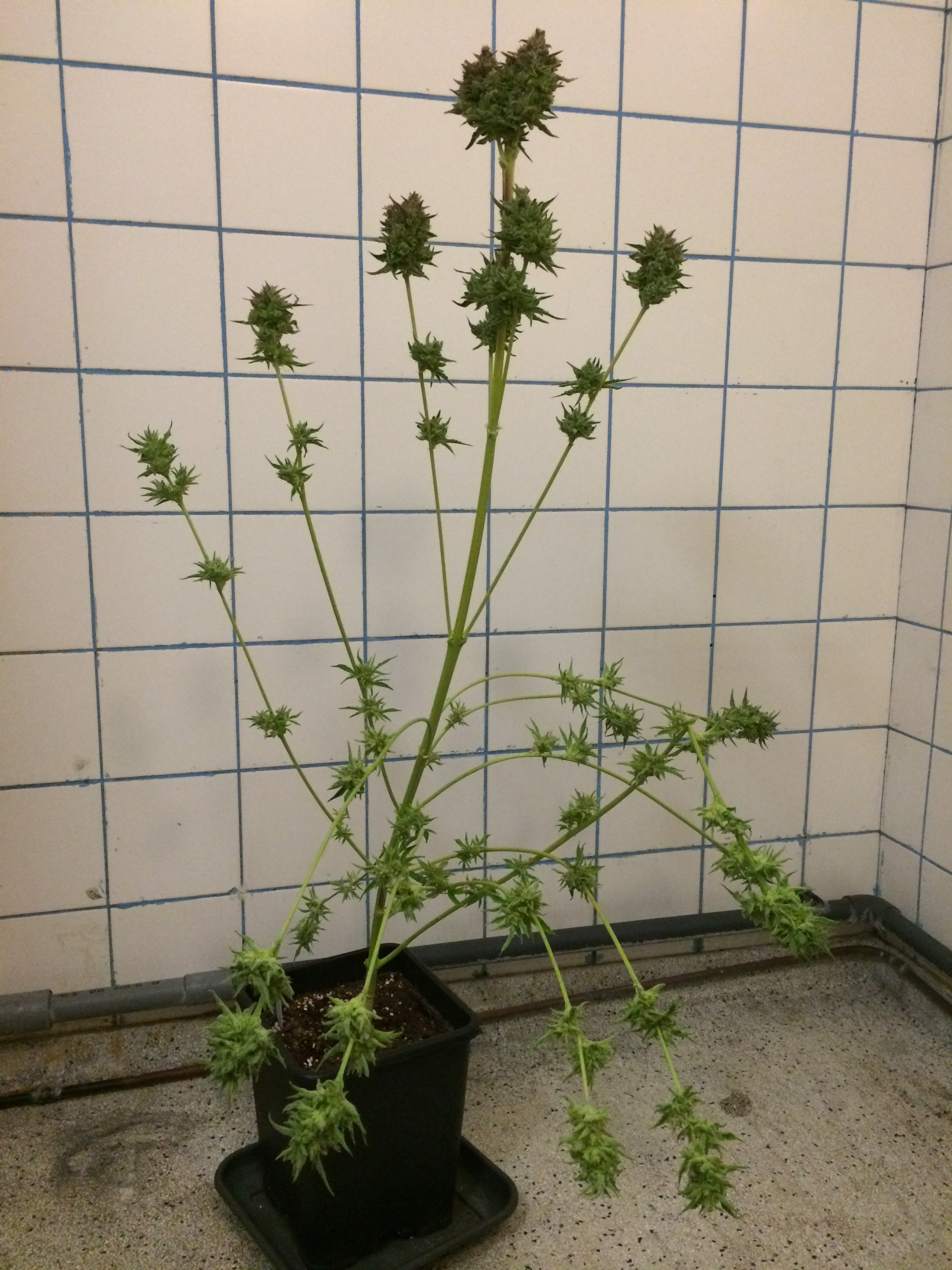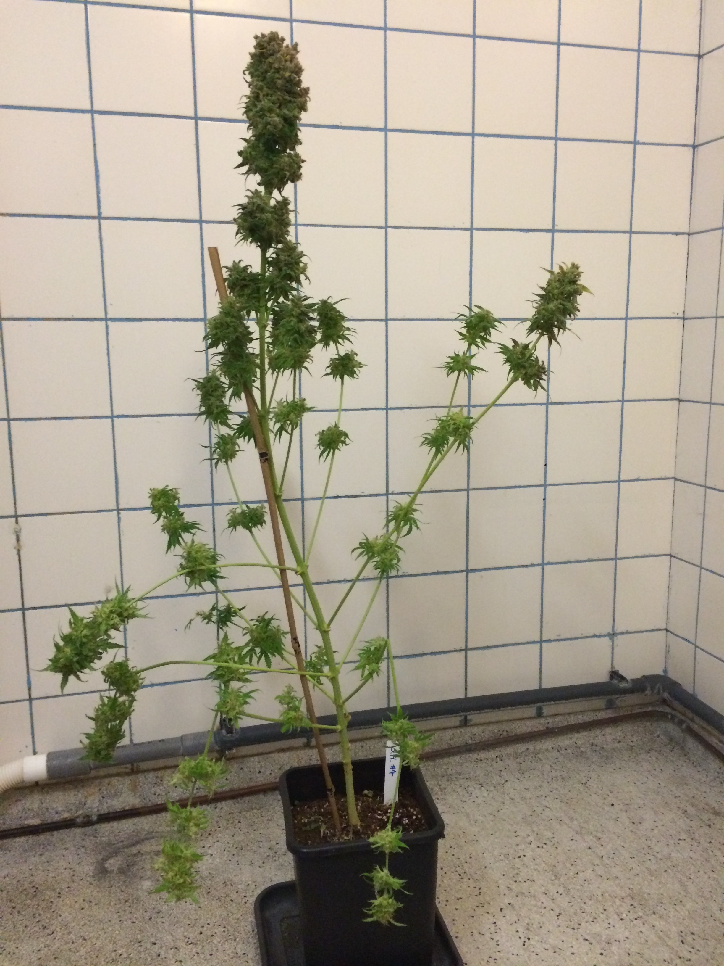 Bij het oogsten neem ik steeds eerst de hele plant uit de kast, zet haar op een tafel en knip dan alle bladeren die groter zijn dan mijn duimnagel, af. Als alle bladeren weg zijn snijd ik de plant helemaal onderaan af, net onder de eerste zijtak. Vervolgens hang ik haar omgedraaid op om te drogen. Ik laat mijn planten in dezelfde kast drogen als waarin ze gegroeid zijn. Gewoon de lampen uit, alle ventilatoren uit en met alleen de afzuiger aan. In het donker worden de planten dan ongeveer 10-14 dagen gedroogd. Wanneer een tak bij het buigen met een duidelijk hoorbare ‘knak’ geluid breekt weet ik dat ze droog genoeg is. Dan worden de buds van de plant afgehaald, verder geknipt en in glazen weckpotten gedaan om te curen.