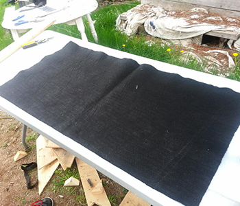 Begin met een rechthoekig stuk worteldoek van het tuincentrum uit te knippen. Zorg ervoor dat de lange zijde twee keer zo lang is als de korte zijde, uiteraard kun je de verhoudingen zelf aanpassen als je lagere of juist hogere potten wil maken, nog een voordeel van deze zelfgemaakte potten. Voor een pot van ongeveer 7 liter neem je een stuk van 35 bij 70 centimeter, maar je kunt natuurlijk iedere maat pot maken die je wil. Hieronder is een lijstje met verschillende maten worteldoek en inhoud van de pot.