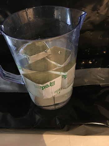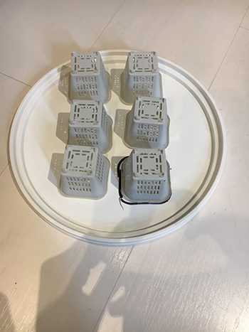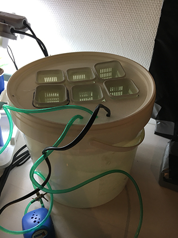 Vervolgens vul je de emmer tot ongeveer een centimeter onder de potjes met water. Het pompje creëert nu bubbels in het water, en die bubbels knappen bovenin kapot. Hierdoor spat er water tegen de onderkant van je plugjes aan, en worden ze vochtig genoeg gehouden.