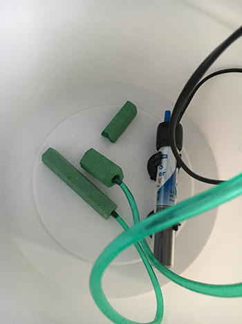 De hoofdingrediënten van je eigen bubble cloner; een emmer, aquariumpomp met bruissteem en een aquariumverwarmer.