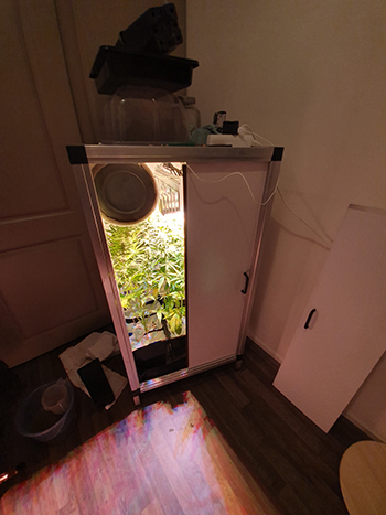 Zoals gezegd zijn mijn opties om de planten onder de duim te houden beperkt. Ik heb de hoogste planten daarom aan de zijkanten gezet, en de laagste dames in het midden onder de lamp. Dit zorgt er wel voor dat er geen toppen te dicht bij de lamp groeien maar is toch niet optimaal. Sommige toppen krijgen nu namelijk niet het licht dat ze verdienen. Ook voor de video’s wordt het nu steeds lastiger om een goed beeld op de camera te krijgen. Je ziet denk ik wel dat de toppen hier en daar voor de lens groeien en andere toppen overbelicht raken.