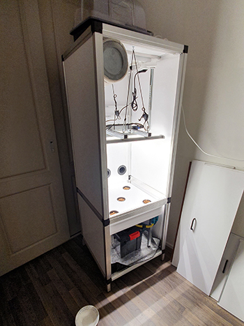 Ook deze kweeklamp heb ik niet eerder gebruikt maar Jeroen heeft er een prachtig resultaat mee gehaald. Ik hoop dat het bij mij ook zo goed uitpakt. Ook de G-Bars kweeklamp heb ik alvast aangezet, ondanks dat er nog geen plant onder staat. De lamp staat op 18/6 omdat ik de temperatuur en de luchtvochtigheid in de kast, en de temperatuur van het water in het hydrosysteem eerst goed wil monitoren. De bevindingen laat ik jullie volgende keer weten.