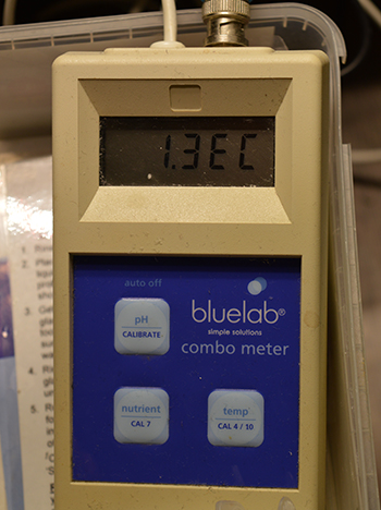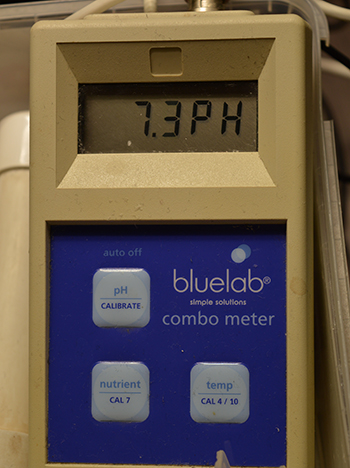 Om er zeker van te zijn dat de plant de CalMag ook kan opnemen heb ik de pH-waarde niet afgesteld. Calcium en magnesium kan namelijk pas goed worden opgenomen boven een pH-waarde van 6,4. De pH-waarde in het systeem is nu 7,3 bij een EC-waarde van 1,3.