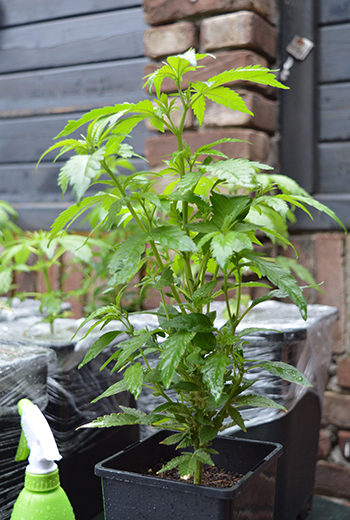 Ook de CNNBS Autoflowers dragen hun steentje bij. Hun onderste bladeren huisvesten een paar hongerige bladmineerders, en over het hoger groeiende blad kruipt hier en daar een spinnetje op zoek naar een bladluis. Voor wietplanten buiten is dat de normaalste zaak. Ik maak me er geen zorgen over, en vraag me zelfs af of al dat geknaag en gekruip niet voor een extra goede groei zorgt. Zo las ik bijvoorbeeld dat hommels planten aanzetten tot bloeien. Ze bijten kleine gaatjes in de bladeren, waarbij ze stofjes injecteren die de bloei opwekt.