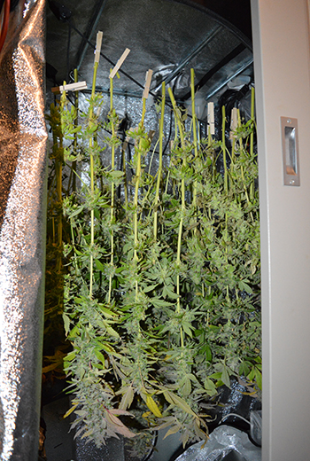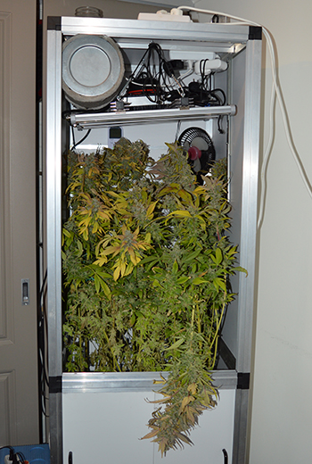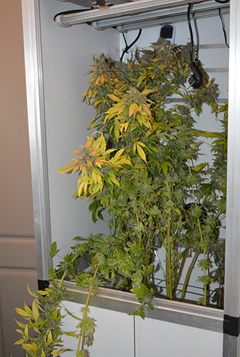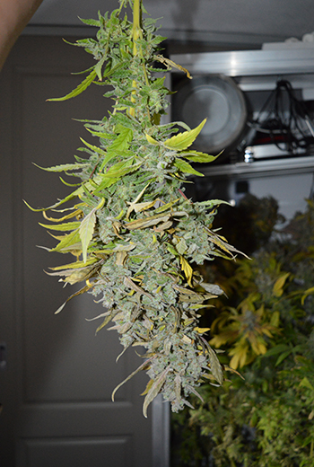De planten waren overigens écht klaar om geoogst te worden. Alle bladeren waren geel en bruin geworden en de takken zakten al in door het gewicht van de toppen. Toen ik de kweekkast open deed begaf een van de stammen het spontaan, waardoor de dikste top van het stel zo uit de kweekkast viel! Ik heb de toppen één voor één afgeknipt en ondersteboven te drogen gehangen, zonder de bladeren te verwijderen. In de droogtent is het donker en draait alleen een afzuiger; zo kunnen de toppen lekker langzaam drogen.