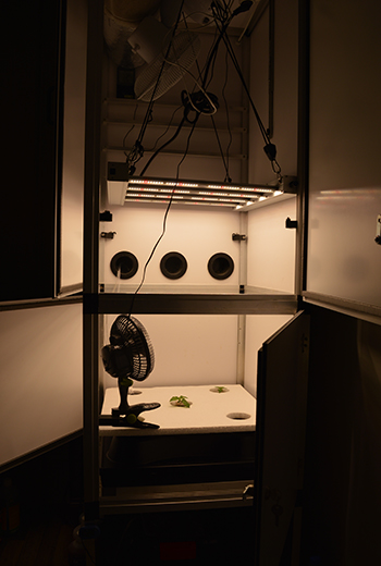 Om het water zo koel mogelijk te houden heb ik een piepschuim plaat op de growtray van het systeem gelegd, een extra ventilator in de kast geplaatst, de 170 Watt G-Bars LED extra hoog gehangen en op 40% gedimd, doe ik een koelelement in het water, én laat ik de deuren van de kast open. Dat laatste kan nu nog wel maar als de planten straks groter zijn en hun heerlijke geur loslaten, dan is kweken met de deuren open geen optie meer. Bovendien heb ik geen zin om steeds met een koelelement in de weer te zijn.