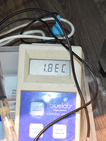 Hydrokweken is zo eenvoudig (en efficiënt) dat ik de afgelopen week niets heb gedaan. De pH- waarde was aan het einde van mijn verslag van vorige week 5,8 en de EC-waarde had ik afgesteld op 1,6. Toen ik vandaag ging meten bleek de pH-waarde gestegen naar 6,2 en de EC-waarde was eveneens gestegen naar een waarde van 1,8. Dit betekent dat de plant deze week meer water heeft opgenomen dan voeding (immers, de EC-waarde steeg, en er is water verdampt). Het betekent dus ook dat de behoefte aan voeding wat lager is dan de hoeveelheid voeding in het water.
