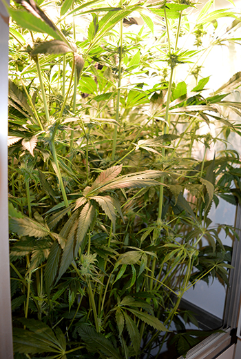 De bruine plekken die je hier en daar op de bladeren ziet, zijn veroorzaakt door de lamp toen die nog iets lager hing en hebben dus niets met de gezondheid van de plant te maken. Wat lager in de kast groeien inmiddels wel heel veel topjes en takken die ik eigenlijk weg zou moeten halen omdat ze te weinig licht krijgen. Ik durf dit echter nog niet te doen, omdat ik vrees dat de plant dan nog meer zou kunnen strekken. Het moet echter wel gebeuren maar ik wacht er nog even mee voor de zekerheid. Op de volgende foto’s zie je wel wat een jungle het onder in de kast geworden is.