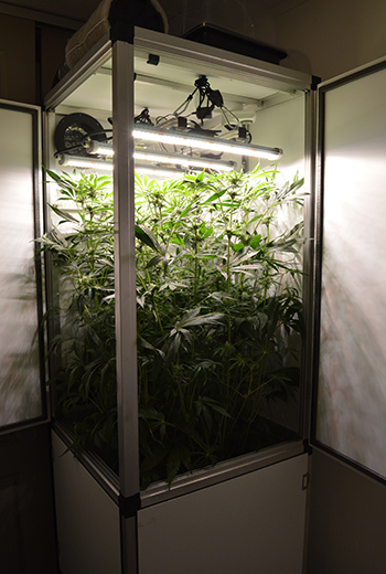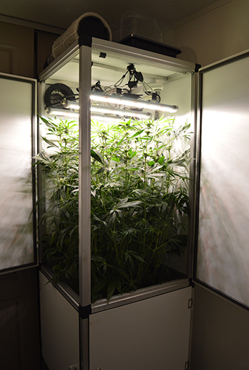 En, zag je het? Om ruimte voor de lamp te maken heb ik het koolstoffilter en de demper uit de DGS gehaald. Maar uiteraard niet zonder die te vervangen. Helemaal zónder filter verder kweken is immers geen optie want de Do Si Dos meurt behoorlijk ondertussen. Gelukkig had ik nog een afzuiger, filter en slang in mijn droogtentje hangen, die ik aan de buitenkant van de kast kon monteren. Niet de allermooiste oplossing maar het voldoet. Gelukkig is mevrouw Do Si Dos inmiddels wel uitgegroeid.