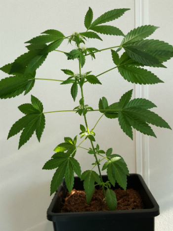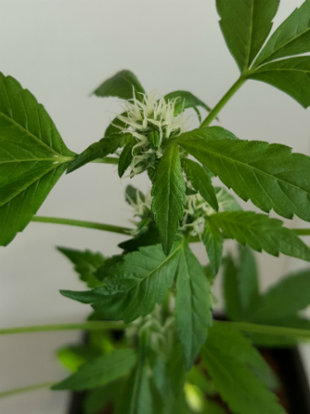 Toen ik de zaadjes voor deze ronde in de G-Kit ontkiemde, heb ik er één extra laten kiemen voor het geval er eentje niet uit zou komen. Dat doe ik eigenlijk altijd wel, gewoon het zekere voor het onzekere nemen. Maar goed, alle zaadjes kwamen wel uit en ik heb dit ene extra plantje toen voor de gein voor het raam gezet. Het was nog vroeg in het seizoen en de dagen waren nog kort. Hierdoor is dat ene plantje dus ook gaan bloeien. Indrukwekkend is ze allerminst, maar toch leuk om te zien, ik wilde het jullie niet onthouden.