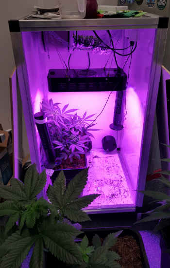 Wanneer ik de kast open, ruik ik de planten nu ook al een stuk sterker, een teken dat de bloeifase niet zo lang meer op zich zal laten wachten. Ik denk dat ik jullie volgende week de eerste bloeihaartjes kan laten zien. Maar aangezien dat nu nog niet het geval is, en de planten nog steeds flink aan het groeien zijn, heb ik de LED-kweeklamp nog niet op de bloeistand gezet. De bloeistand schakelt een aantal extra rood gekleurde led’s in werking waardoor het lichtspectrum en het wattage optimaal is voor bloeiende wietplanten. Zodra ik de eerste bloeiharen zie en de groei echt uit de planten is zal ik de bloeistand inschakelen.