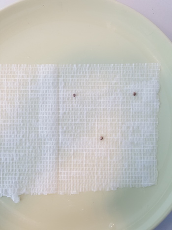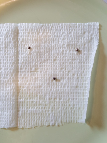 Afgelopen vrijdag heb ik de drie zaden dus tussen een dubbele laag vochtig keukenpapier gedaan en in een gripzakje in de toen nog donkere kweekkast opgehangen. Vandaag kon ik ze in potjes met aarde overzetten. Deze ontkiem methode is heel makkelijk en kan eigenlijk niet misgaan. Je begint met een stuk keukenpapier dat je vochtig maakt. Niet druipend van het water, dus even zachtjes uitknijpen. Dit leg je op een bord en vervolgens verdeel je je wietzaden over één helft van het papier. Let er hierbij op dat je de puntige kant van de zaden (wietzaden hebben altijd een naveltje en een puntje) naar beneden richt, hieruit groeit namelijk het worteltje. Door de puntjes naar beneden te richten groeien de worteltjes ook netjes naar beneden.