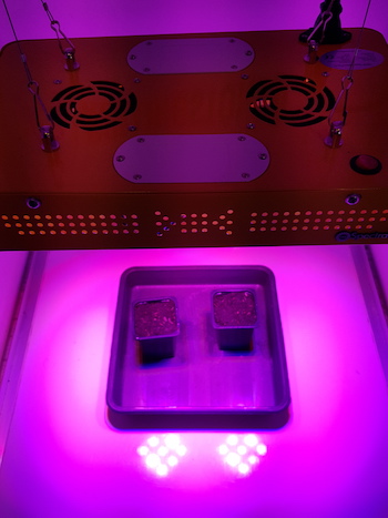Twee planten onder de Spectrabox Pro, zo heeft iedere plant zijn eigen LED-lichtbundel