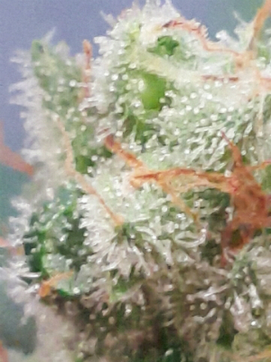 De trichomen zijn wel bijna allemaal troebel wit, maar aangezien ik nog geen amberkleurige trichomen heb kunnen spotten is dit nog een reden om de oogst nog even uit te stellen. Op de rechterfoto van een van de CBD Kush toppen hierboven zie je dat de trichomen op deze soort goed vertegenwoordigd zijn. Het is moeilijk om ze scherp op de foto te krijgen zonder statief.