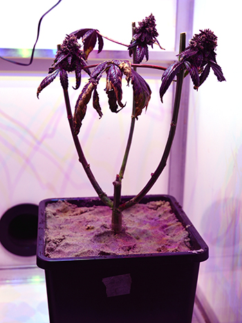 Hij heeft een weekje rust gehad maar ondertussen was er weer werk aan de winkel voor onze groene kweekdokter. Zijn oogst moest hoognodig geknipt worden, en zijn moederplanten in wording hadden nog steeds last van de varenrouwmug. De oplossing? Ontwortelen die hap en dan hup, zand erover!