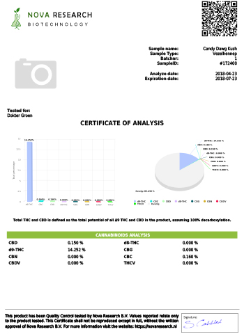 De wietzaden zijn binnen, dus het feest kan beginnen! Ik verklap zo welke heerlijke wietsoort ik voor deze ronde heb besteld, maar eerst wil ik de testresultaten van de oogst van de Dinamed CBD en de Candy Dawg Kush met jullie delen. Ik heb die namelijk, samen met de wietolie die ik laatst maakte, laten testen bij Nova Research.