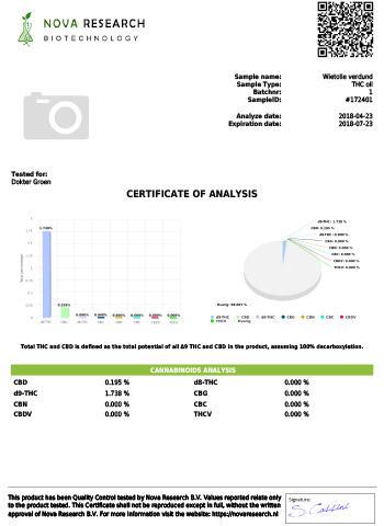 Dankzij de test weet ik nu zeker dat de Dinamed CBD echt geen, of in ieder geval een verwaarloosbare hoeveelheid THC bevat. Dat was eigenlijk ook wat ik verwachtte. Wat ik niet had gedacht was dat de pure wietolie met de oude wiet helemaal geen CBN bevat. De Candy Dawg Kush sample die ik kweekte had ongeveer 15 procent THC. En de verdunde olie kan ik beter als slaolie gebruiken, want die bevat maar zo’n 1,8 procent THC!