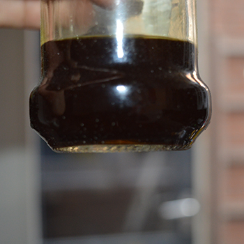 De andere helft deed ik in een glazen potje die ik ‘au bain marie’ liet indampen. Als je dit ook gaat doen, gebruik dan een elektrische kookplaat en ventileer goed want alcoholdampen zijn brandbaar en ongezond om in te ademen. Na een uur of drie indampen, bleef er nog een kleine hoeveelheid donkere alcohol over.