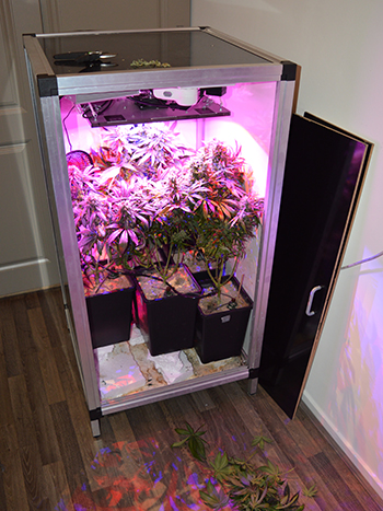 Ik heb nu dus een knoop in de slangetjes gelegd maar helaas kwam ik er pas na drie dagen achter dat de ongebruikte Blumat druppelaars de lekkage hadden veroorzaakt. De planten hebben er gelukkig niet zoveel last van gehad aangezien die op een verhoging staan, maar de kast heeft misschien wel wat schade opgelopen. Jammer genoeg heb ik nog de oude versie van de CNNBS G-kit met gelamineerde MDF platen, en niet de nieuwe versie met watervaste kunststof platen. Die kunnen namelijk gewoon kletsnat worden zonder dat ze beschadigen.