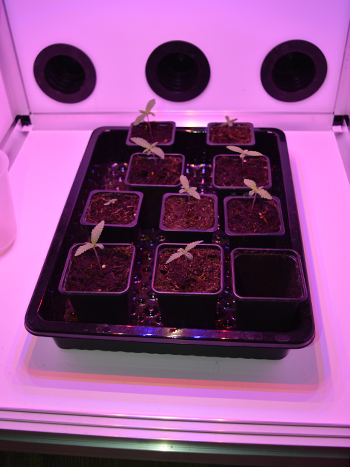 Het is al bijna de hele week fantastisch weer, het zorgde voor een aangenaam temperatuurtje voor de negen zaailingen in mijn CNNBS. Een graadje of 28 is helemaal niet zo slecht voor zaailingen. Ze groeien goed wanneer ze een beetje zweten maar het is wel opletten dat de aarde niet uitdroogt. De potjes zijn maar klein dus dat kan binnen een dag het geval zijn.