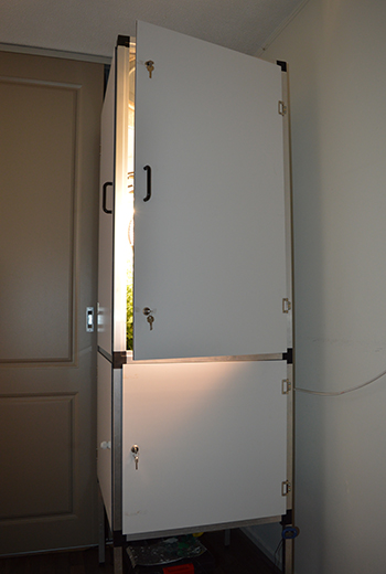 Niet om mezelf nou op de borst te kloppen maar ik heb de methode van slechts één wietplant in het Flow Hydroponics 3-in-1 Systeem voor mezelf geperfectioneerd, en ben daar ook best trots op. De methode zorgt steeds weer voor een wietplant die het gehele kweekoppervlak in korte tijd vult met het maximale aantal toppen, en is voor iedereen na te doen door simpelweg mijn kweekverslagen na te doen. De dubbele klapdeuren van mijn kweekkast zorgen ervoor dat ik overal goed bij kan, en omdat het waterreservoir van het hydrosysteem onder de kast is geplaatst, is er in de kweekkast meer ruimte voor de plant.