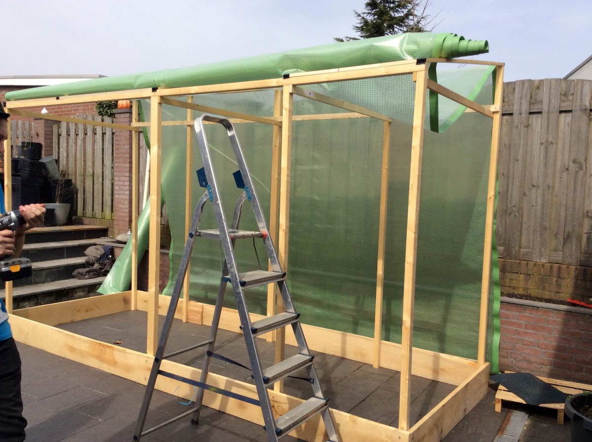 Het dak hebben we gemaakt met de panlatten. Deze hebben we ook gebruikt om de constructie te verstevigen. Omdat we eerder met een koepeldak wilden werken hebben we besloten om het zeil in een later stadia aan te spannen met pvc. Ook kunnen we er nog een koepel op zetten wanneer de planten toch hoger worden dan het dak van 2 meter 40.