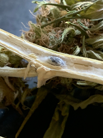 Als de stammen door de houtwormkever zijn aangetast, dan zie je waarschijnlijk ook aantastingen maar dan met een soort zwarte korreltjes. Hier heb ik ook foto’s van: