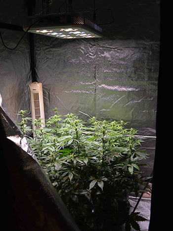 De vijf wietplanten staan er mooi bij in de grote BudBox kweektent. Inmiddels zitten ze stuk voor stuk vol met recht omhoog groeiende toppen. Het viel me alleen op dat één van de planten steeds haar bladeren liet hangen. Na drie dagen ben ik maar eens gaan kijken waar dat aan zou kunnen liggen. Ik kwam erachter dat de plant in kwestie buiten het bereik van de ventilator stond. Ze viel dus buiten de boot om het zo maar te zeggen en kreeg niet genoeg wind.