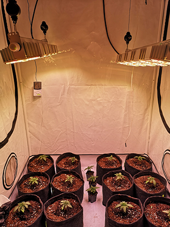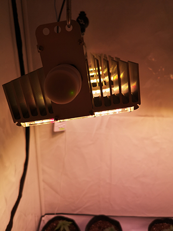 In mijn kweektent staan nu 12 potten (in 3 rijen van 4) en daarboven hangen twee Q5W-Generatie 2 LED kweeklampen van SANlight. Ik was zo tevreden met de kweek van de Serious Happiness onder de Q4W-Gen.2 dat ik direct een upgrade deed en nu de Q5W-Gen. 2 in deze tent heb opgehangen. Iedere Q5W heeft 205 Watt, zodat ik nu 410 Watt aan LED kweeklicht in mijn tent heb schijnen.